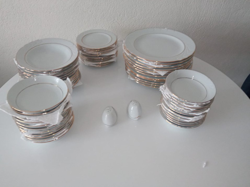 Altın kenarlı beyaz yemek tabakları ve tuzluk biberlikten oluşan zarif set. Farklı boyutlarda tabaklar içerir. ️62 parça