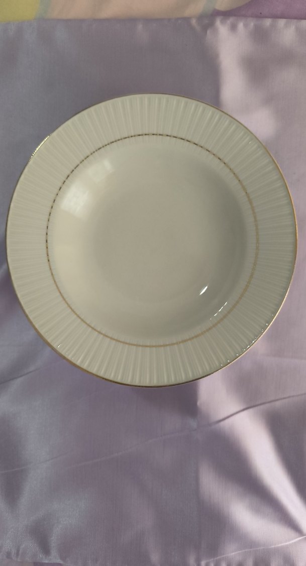 Altın şerit detaylı, dokulu kenarlı beyaz yemek tabağı, çeşitli yemekler için uygundur. ️