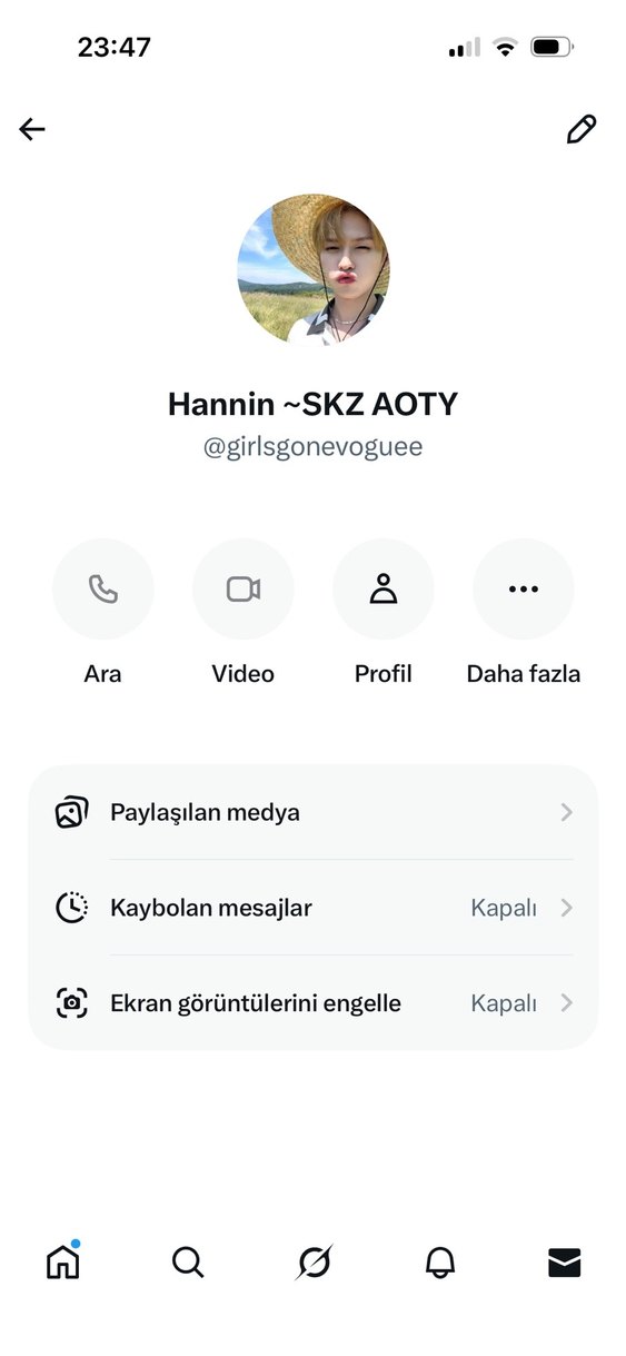 Beyaz Android telefonun ekran görüntüsü, Ara, Video, Profil gibi seçenekler ve paylaşılan medya, kaybolan mesajlar, ekran görüntülerini engelleme özelliklerini gösterir.