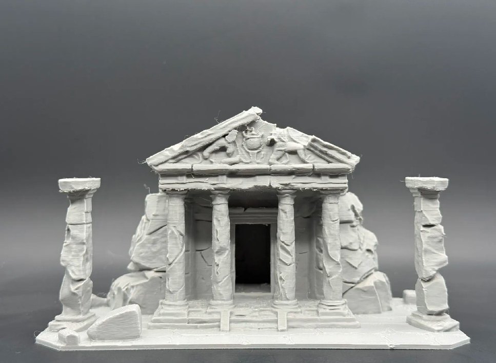 Beyaz ve gri renkteki bu figür, detaylı sütunları ve heykelleriyle antik bir tapınağı yansıtıyor. ️