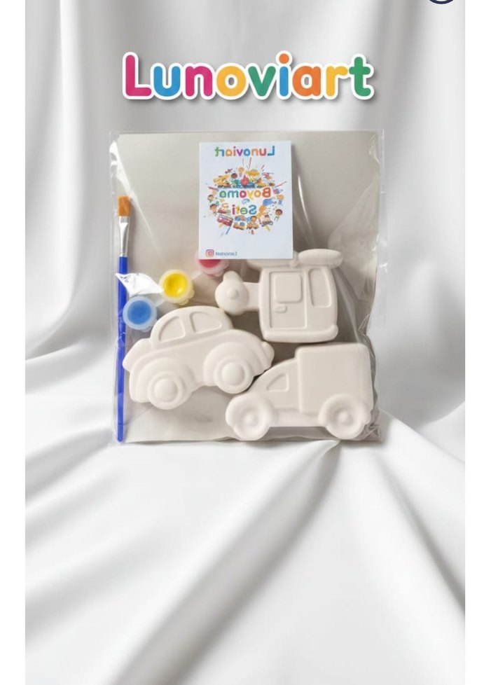 Lunoviart markalı, pürüzsüz malzemeden beyaz araba ve kamyon ile boya kutuları ve fırça içeren boyama seti.