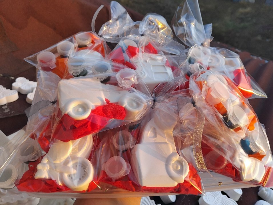Beyaz araba şeklinde, kırmızı kağıtla paketlenmiş, şeffaf poşet içinde parti süsleri .
