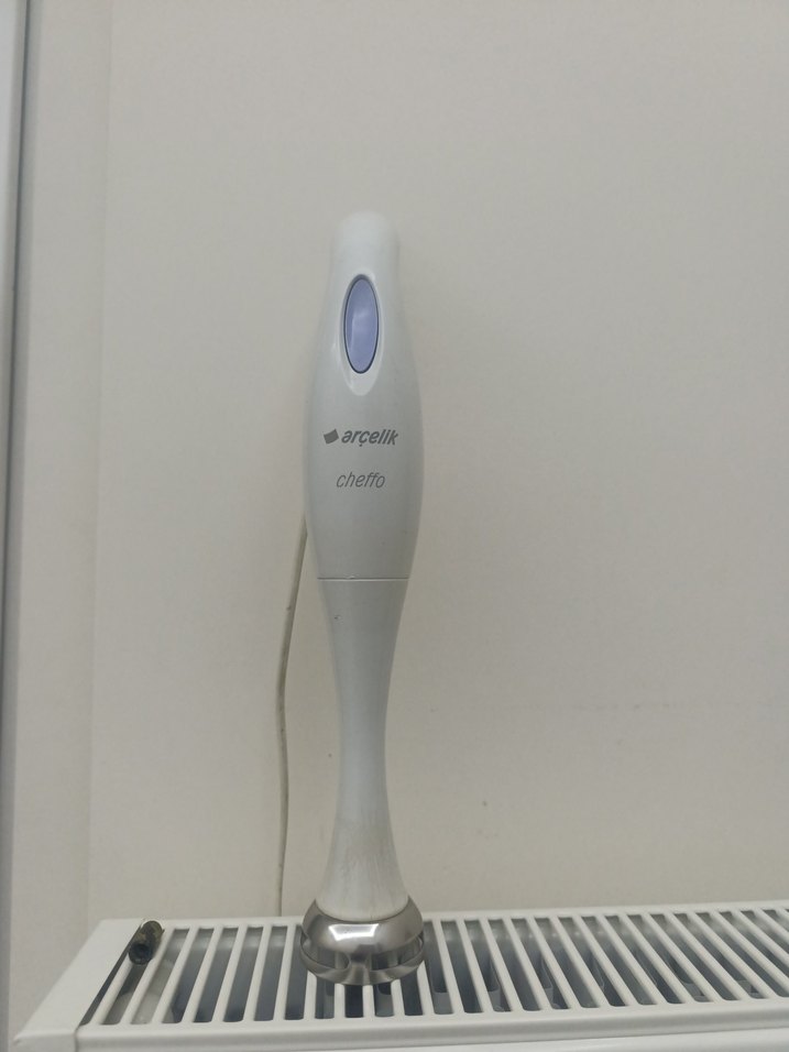 Gri detaylı beyaz Arçelik Chelto el blenderı, karıştırma ve doğrama için uygundur. Düğmeli basit tasarıma sahiptir. kılcal çizikler mevcut.