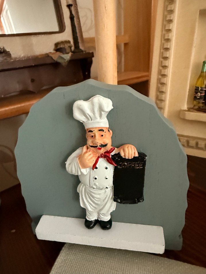 Beyaz kıyafetli aşçı figürünün siyah kahve tabelası tuttuğu dekoratif obje. Koyu arka plan üzerinde şık bir görünüm sunar. ☕