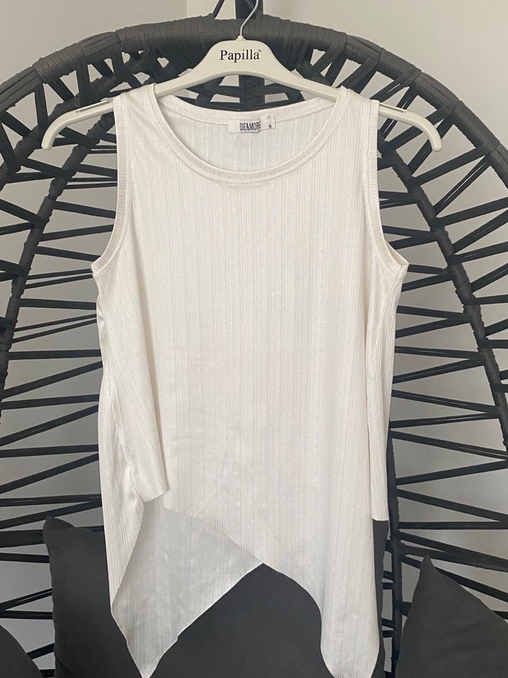 Beyaz, asimetrik ve bol kesimli bluz. Normal midi boyda, günlük kullanıma uygun.