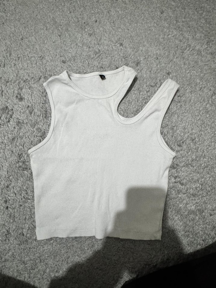 Beyaz, asimetrik yaka ve pamuklu kumaştan yapılmış, vücuda oturan kesimiyle günlük rahat ve şık bir kadın atleti.