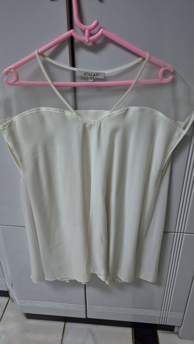 Beyaz askılı, drapeli ve bol kesim kadın bluz. İpek gibi kumaştan, midi boyda, desensiz ve günlük kullanıma uygun. Marka: ATALAR.