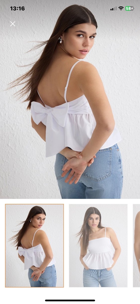 Beyaz ince askılı ve straplez yaka tasarımlı, rahat kesim midi boy kadın bluz. Arkada büyük fiyonk detayıyla gündelik kullanıma uygun. İki kez giydim