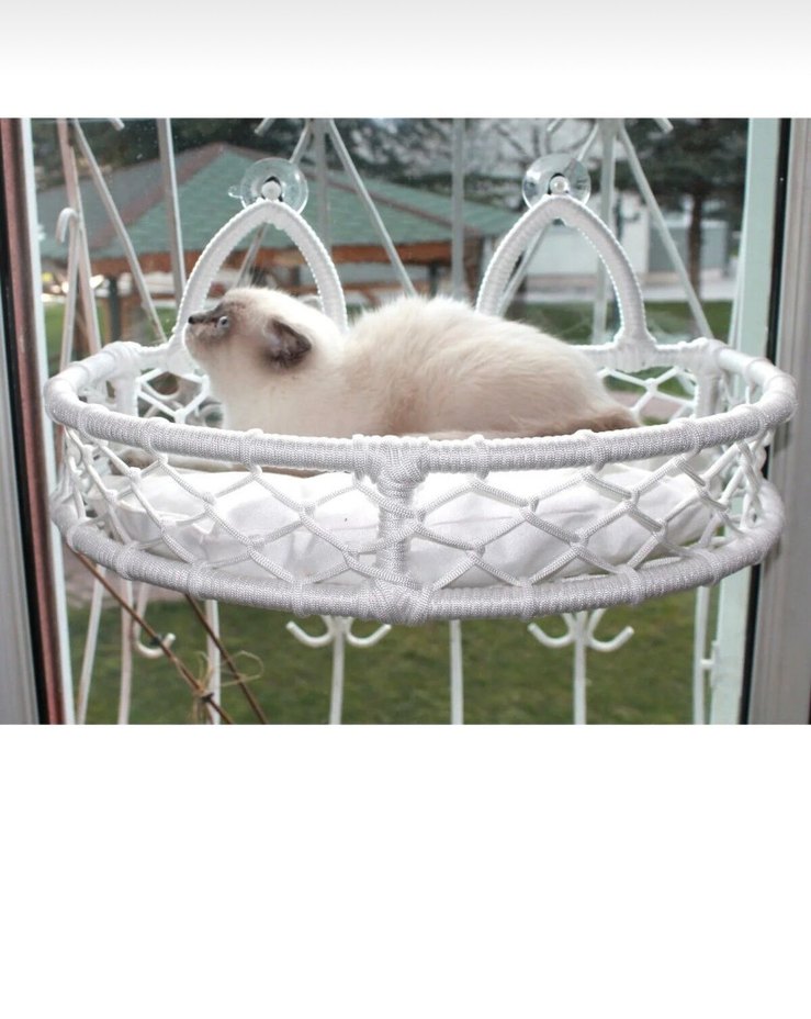 Beyaz, örgü tasarımlı askılı kedi yatağı, kediler için rahat dinlenme alanı sağlar. Pastel ton yumuşak bir görünüm sunar.
