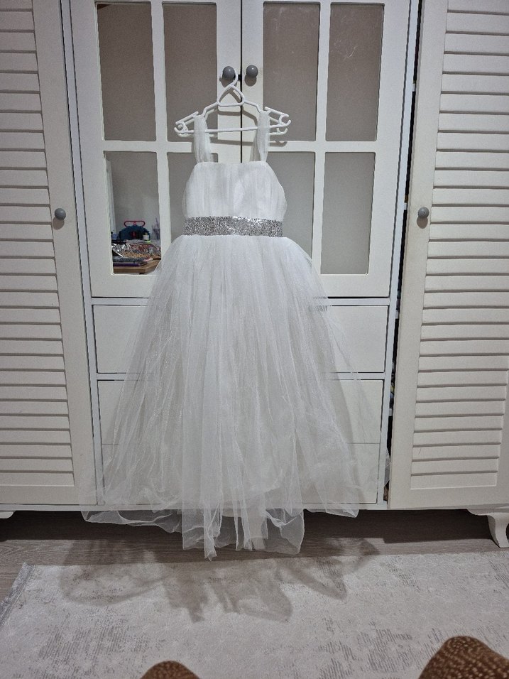 Beyaz askılı, kemerli ve bol tül etekli çocuk abiye elbise, klasik ve modern şıklık sunar tülünde ve astarında ve yırtık var 10 yaş yazıyor ama 8 yaşa uygun