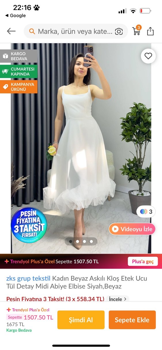 Beyaz askılı, kare yakalı, vücuda oturan üst kısmı ve tül detaylı kloş etek ucu ile modern klasik bir midi elbisedir. YENİDİR BİRİ FAYDALANSIN DİYE BU FİYATA KOYUYORUM