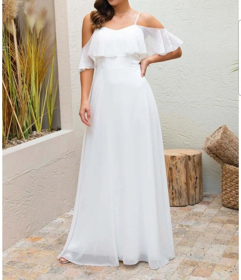 Beyaz renkte, straplez yakalı ve drapeli detaylı uzun bohem elbise. İp askılı kollara sahip, bol kesim ve yumuşak sentetik kumaştan üretilmiştir.