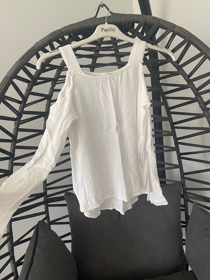 Askılı kolsuz görünümlü, salaş kesimli beyaz keten bluz. Bohem tarzda, drapeli ve desensiz, hafif yapıda.