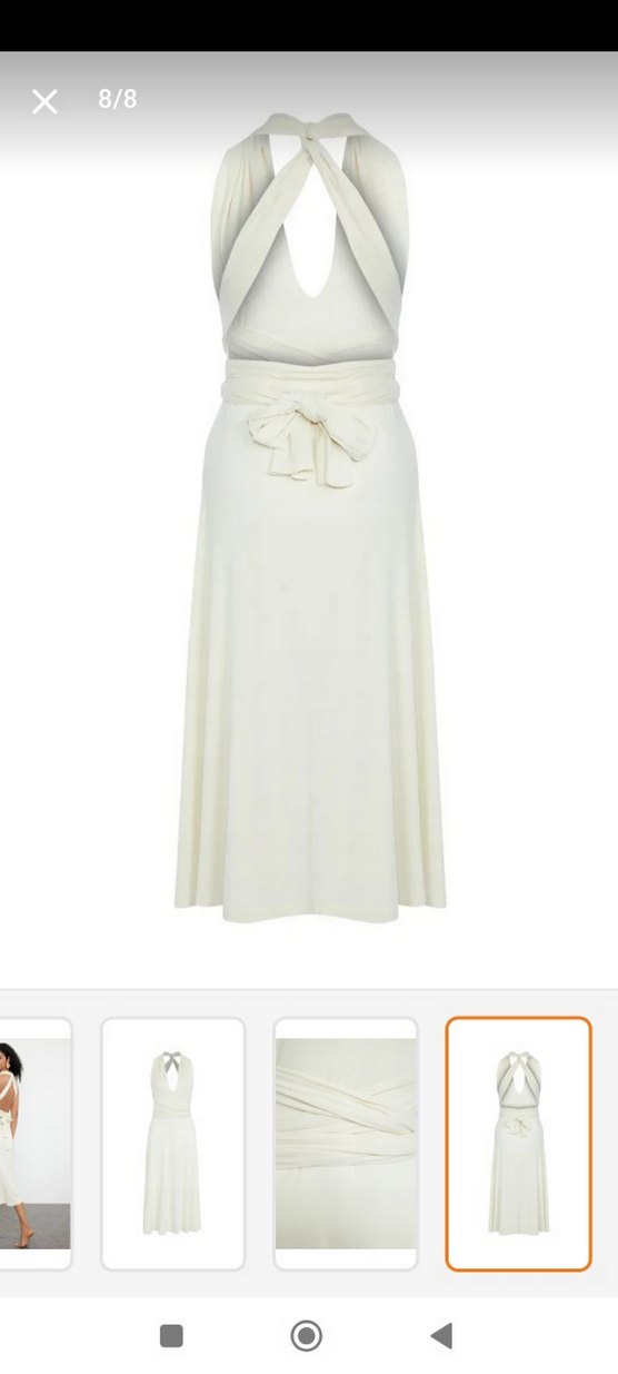 Beyaz, askısız yakalı, dökümlü ve bol kesim uzun elbisedir. Pürüzsüz sentetik kumaştan olup, minimalist tarzıyla düğünler için uygundur.