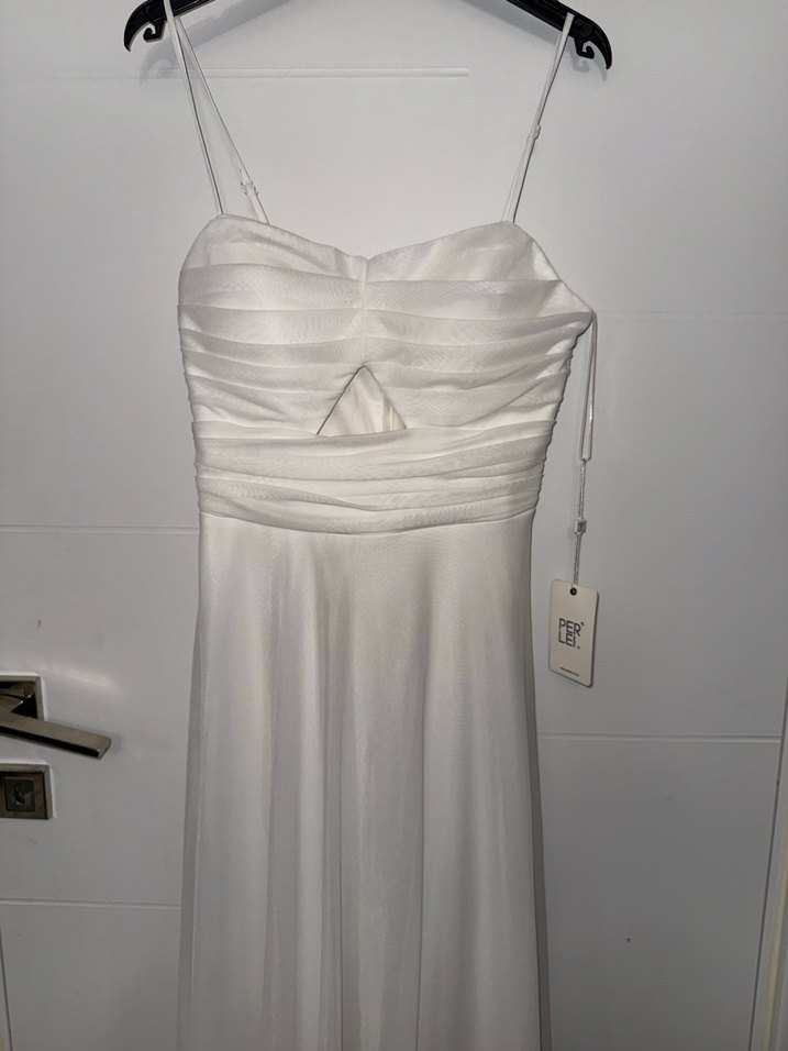 Askılı, straplez yakalı ve drapeli detaylara sahip beyaz, uzun ve vücuda oturan abiye elbise. Modern klasik stil, düğün için uygun. (Ürün hiç kullanılmamıştır etiketi üzerinde)