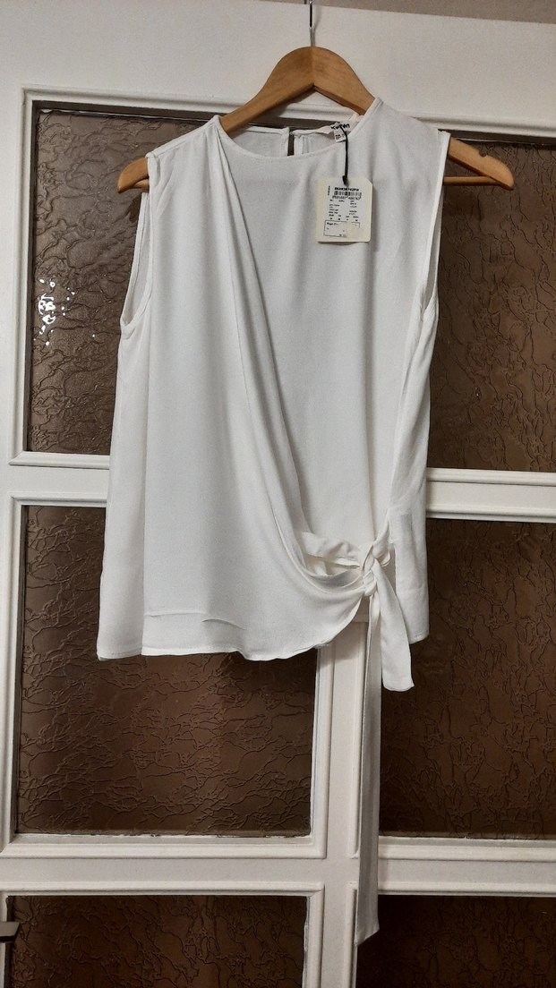 Askısız beyaz bluz, drapeli tasarım, halter yaka ve bol kesim. İpek gibi dokuda, midi boyda, hafif desenli, ofis için uygun. iki koltuk altı arası 46 cm. Boyu 56 cm.
