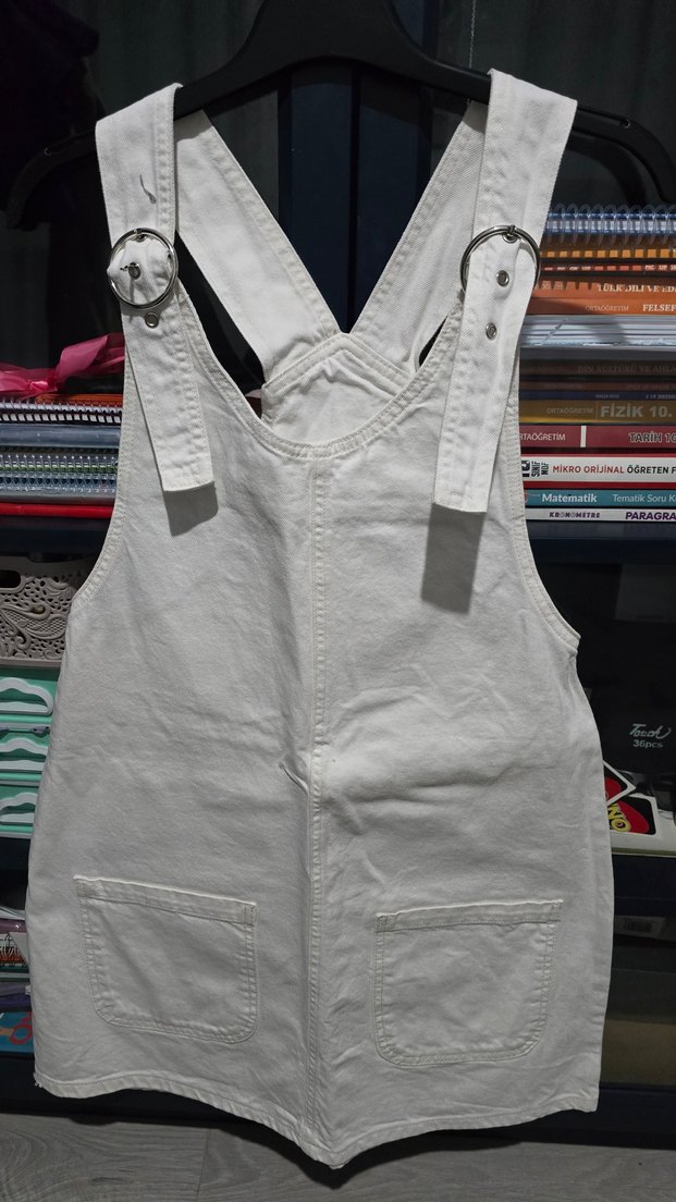 Sentetik kumaştan, bel kemerli ve bol kesim beyaz askısız midi tulum. Günlük rahat kullanıma uygundur.