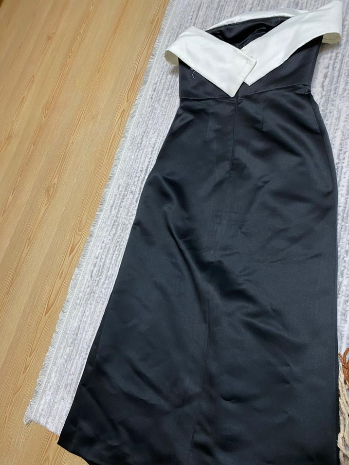 Beyaz askısız uzun siyah elbise