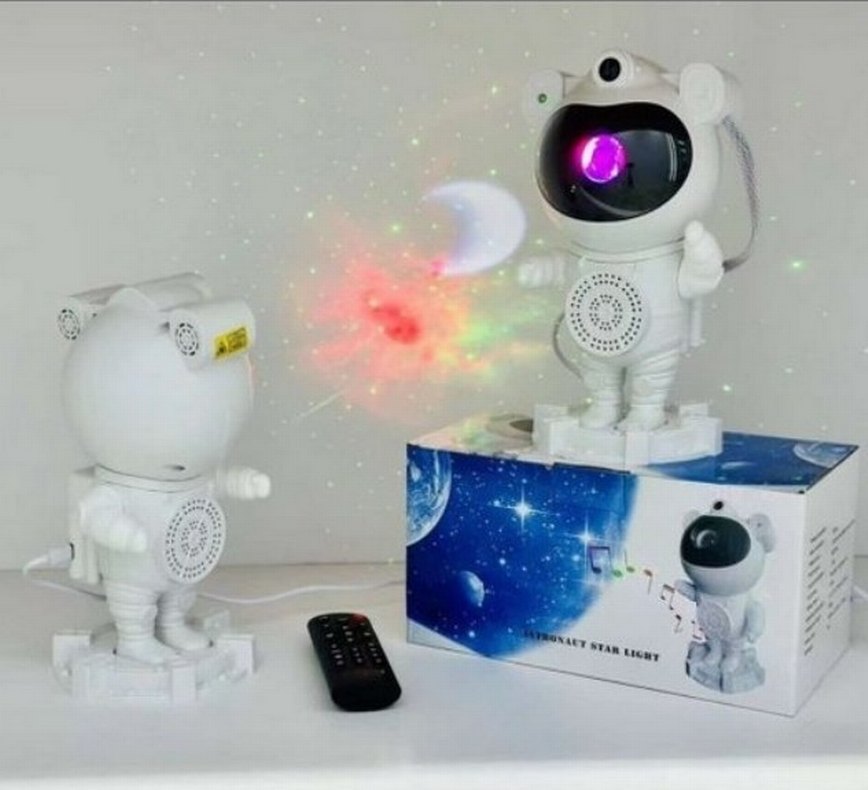 Beyaz astronot şeklinde projeksiyon lambası, uzay ve ay desenleri yansıtır, uzaktan kumandayla kontrol edilir.