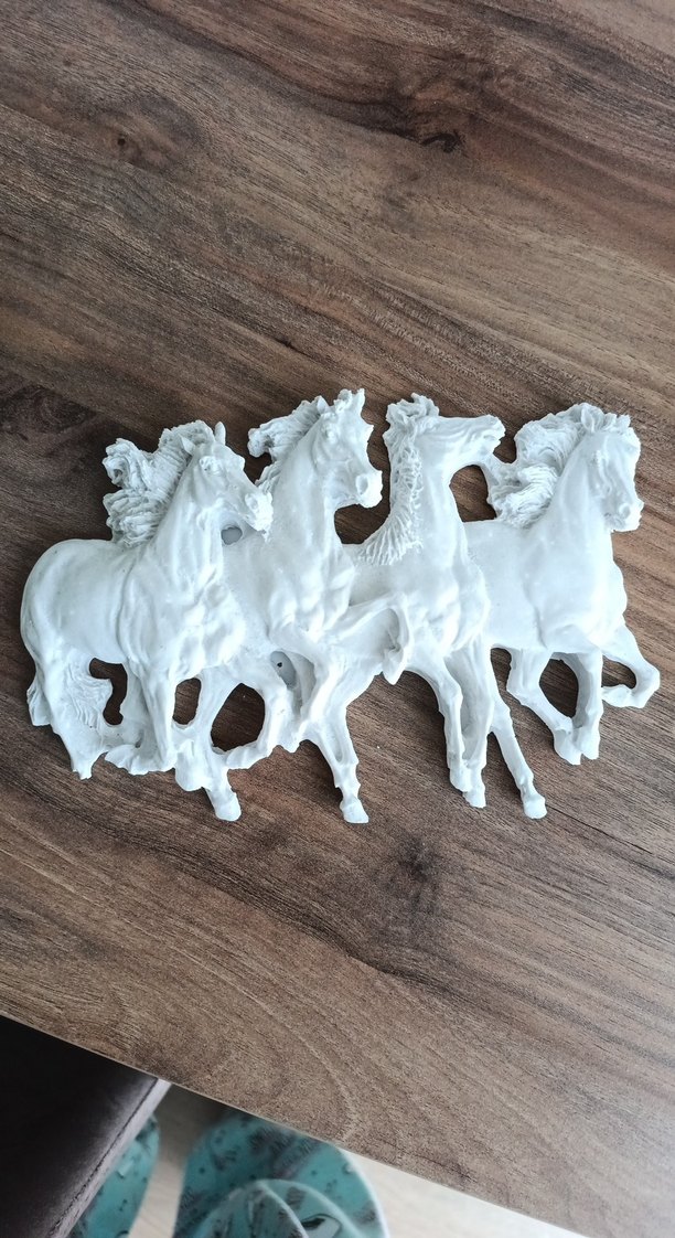 Dört at figüründen oluşan beyaz dekoratif obje, pürüzsüz yüzeyli ve detaylı işçilikli.