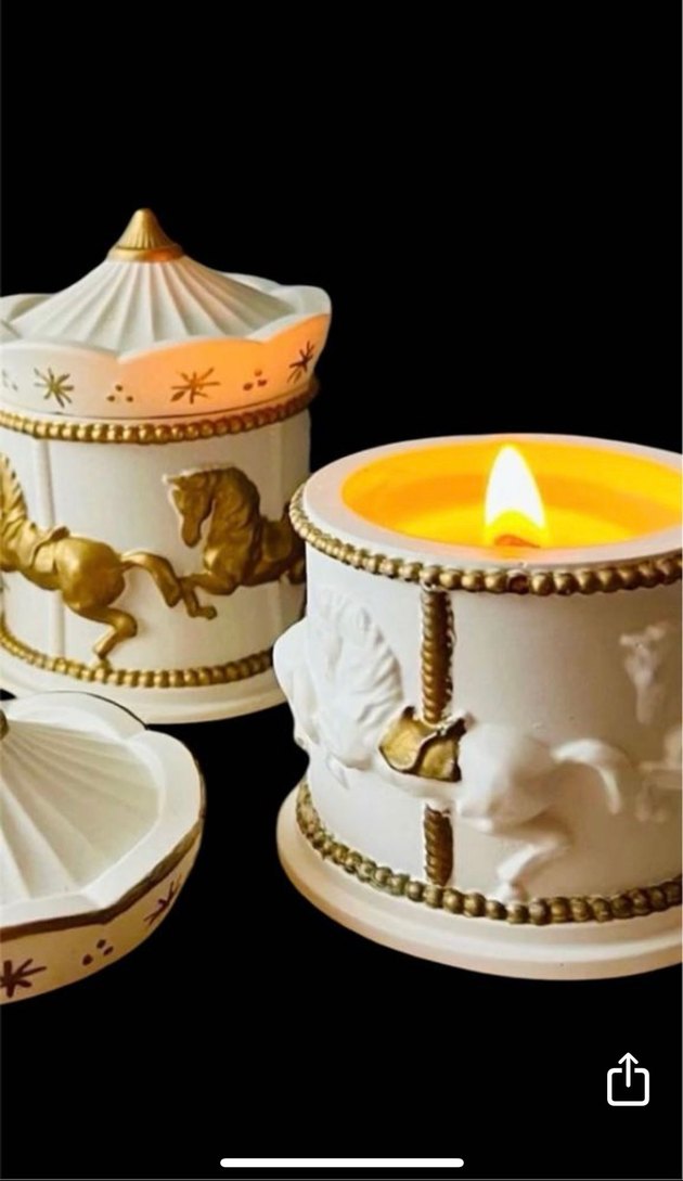 Altın renkli at figürleri ve desenlerle süslenmiş beyaz mum ve mumluk seti. Kapaklı mumluk, şık ve detaylı tasarıma sahiptir. ️fiyat sorulmasını rica ederim