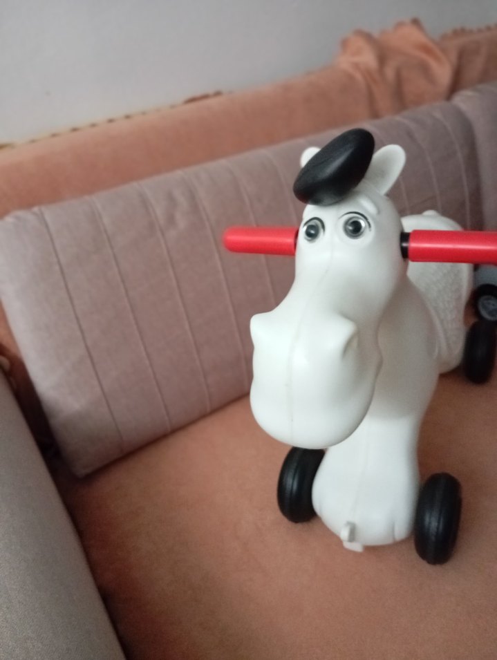 Bu renkli oyuncak, siyah tekerlekli ve kırmızı kulplu beyaz at figürüne sahiptir.