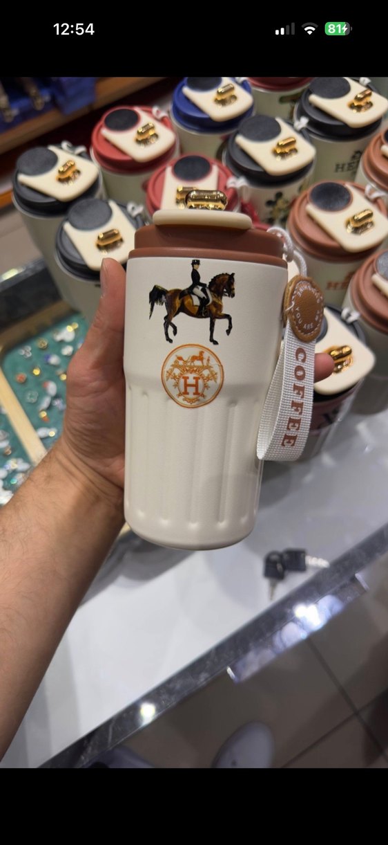 At biniciliği figürlü beyaz termos bardak, kahverengi kapak ve 'COFFEE' yazılı askı ile.