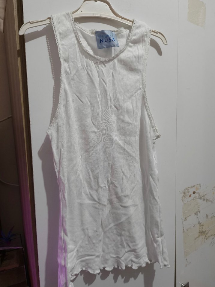 NUSA marka beyaz atlet, yumuşak kumaş ve ince dantel detaylı kenarları ile rahat bir kullanım sunar. Alt kısmı hafif fırfırlıdır.