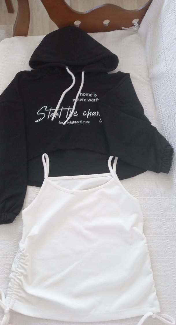 Beyaz atlet ve siyah kapüşonlu crop sweat shirt takım kız çocuk