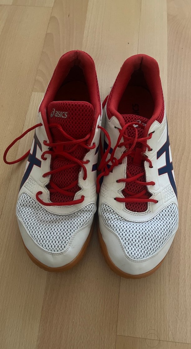 Kırmızı bağcıklı, nefes alabilen file kumaşlı beyaz Asics spor ayakkabılar. Atletik kullanım için uygun, geleneksel tarzda ve renkli detaylara sahip.