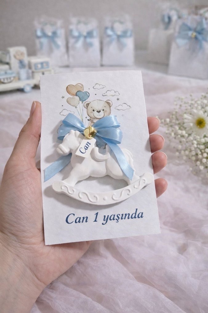 Beyaz sallanan at figürlü, üzerinde ayıcık ve pastel mavi kurdeleli, 'Can 1 yaşında' yazılı kişiye özel magnet.