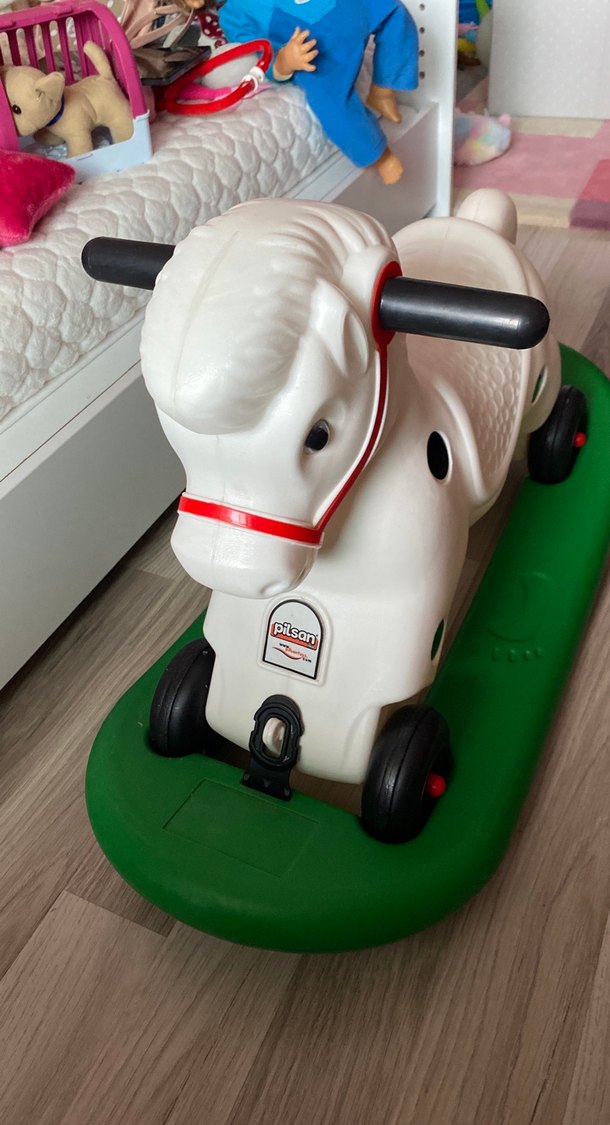 Hiç kırığı çiziği yoktur. Siyah tutacaklı ve tekerlekli, yeşil tabanlı beyaz sallanan at oyuncak. Çocuklar için oturup sallanmak için uygun.