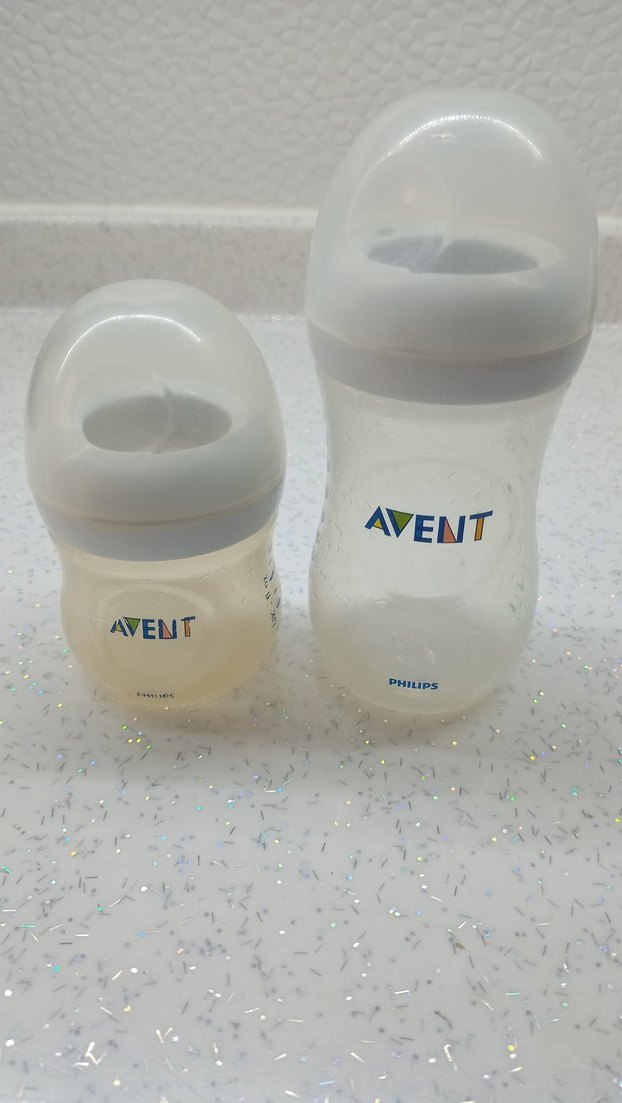 Bu set, bebek beslemek için uygun, güvenli malzemeden yapılmış iki beyaz Avent biberon içerir.