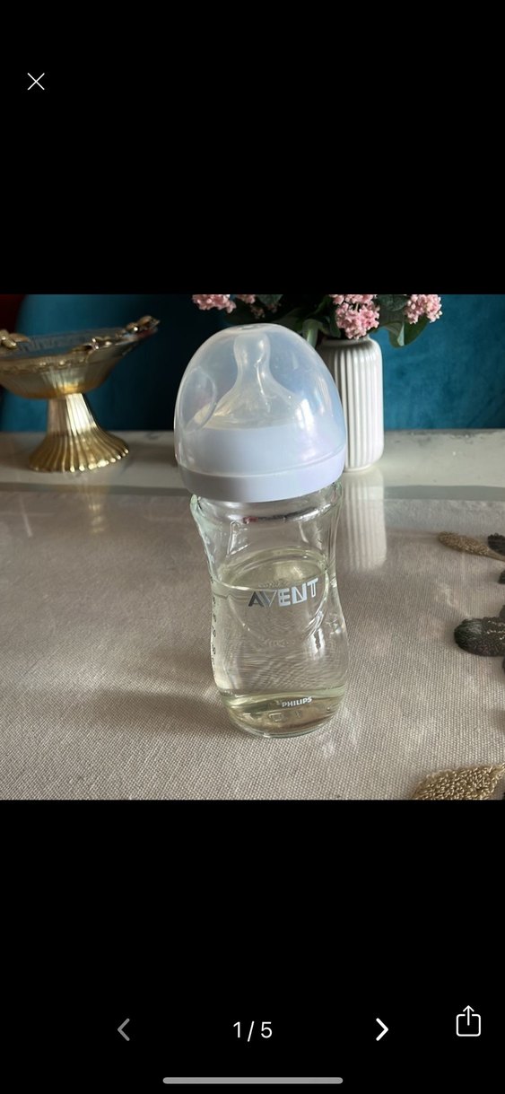 Şeffaf malzemeden yapılmış, yumuşak emzikli ve koruyucu kapaklı beyaz Avent bebek biberonu. Cam phılıps avent biberon
