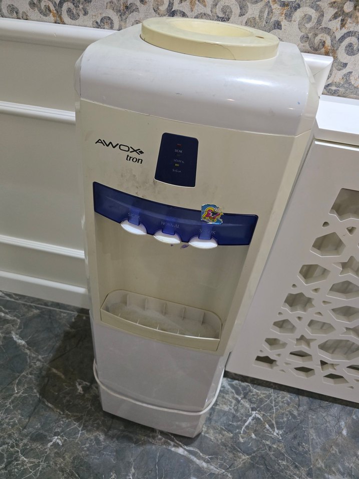 Beyaz renkte AWOX tron su sebili, üç musluk ve üstten dolum açıklığı ile kullanışlıdır.