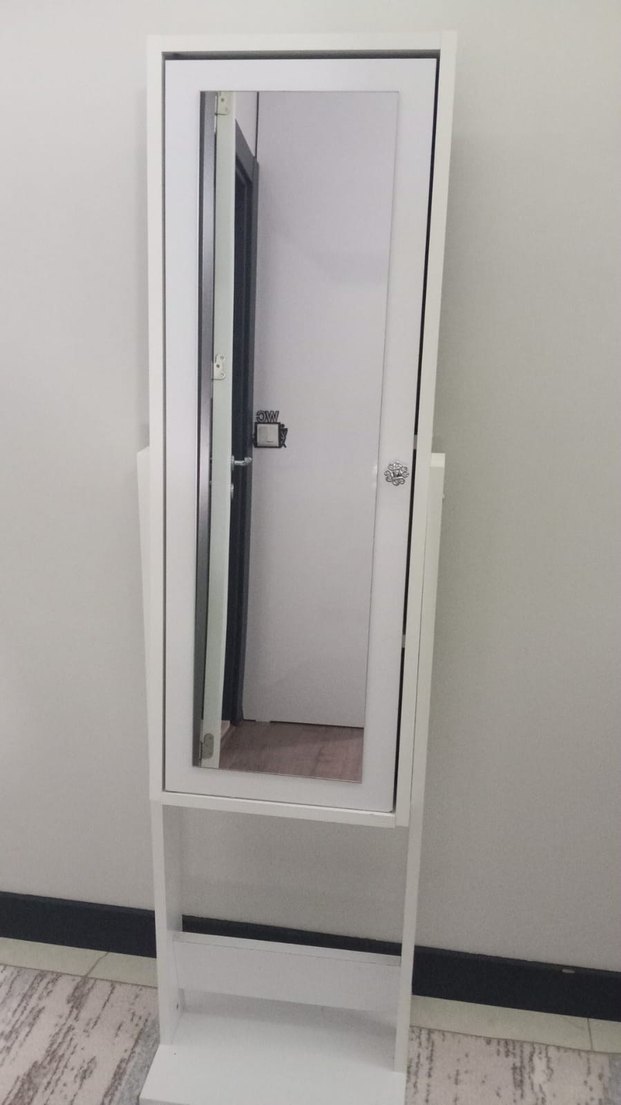 Beyaz çerçeveli, ayakta duran dekoratif boy aynasıdır. Minimalist ve şık tasarıma sahiptir.