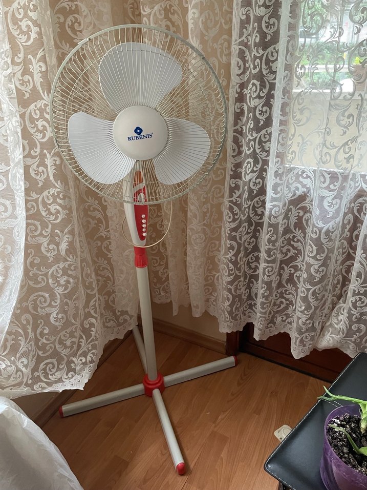 Ayarlanabilir yüksekliğe sahip, üç kanatlı beyaz ayaklı vantilatör. Hava sirkülasyonu sağlar. ️
