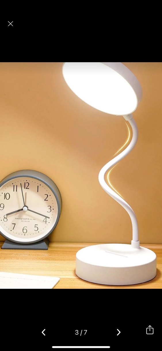 Esnek boyunlu ve yuvarlak tabanlı beyaz ayarlanabilir masa lambası, yumuşak ışık sağlar. Arka plandaki saatte 2, 8, 9, 6, 10, 4 numaraları görülüyor.