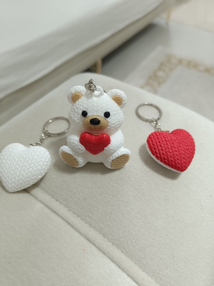Beyaz örgü dokusuna sahip ayıcık anahtarlık, kırmızı kalp tutuyor. Yanında beyaz ve kırmızı örgü kalp anahtarlıklar bulunuyor.