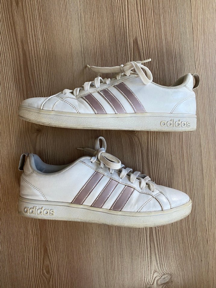 Beyaz, pastel çizgili Adidas bağcıklı spor ayakkabılar. Kauçuk malzemeden, sivri topuklu ve günlük kullanım için uygun. Bazı deformeler mevcuttur