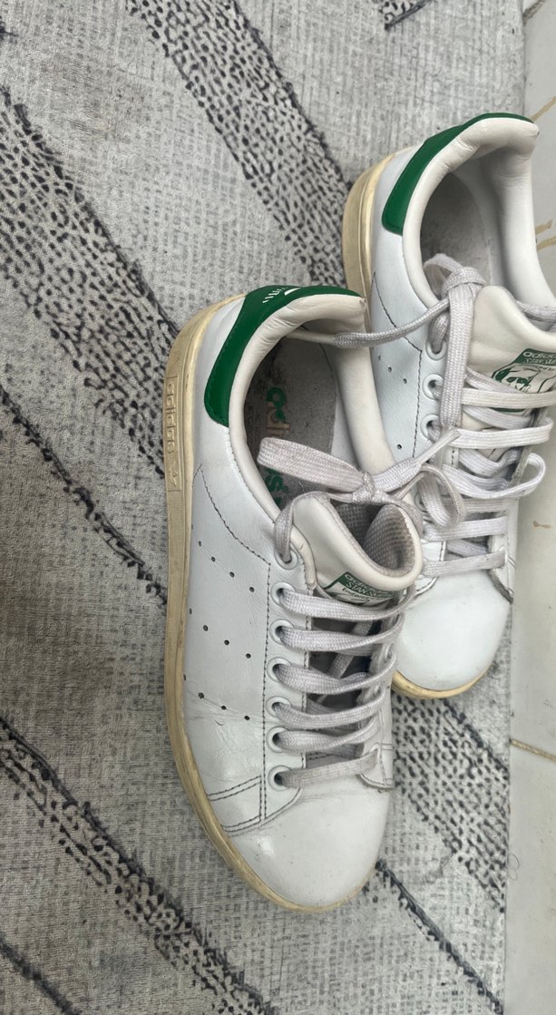 Beyaz bağcıklı spor ayakkabı kauçuk desensiz sade tasarıma sahip. Spor ve günlük marka biraz kirli sadece fırsatım olmadı yıkamaya alan kişi yıkasın o yüzden uygun bırakıldı