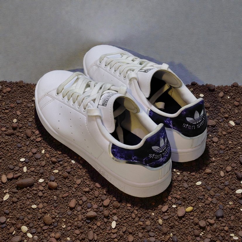 Beyaz Adidas bağcıklı sneakers, topuk kısmında koyu tie-dye detaylı, stiletto topuklu, trend casual tarzı için uygun.