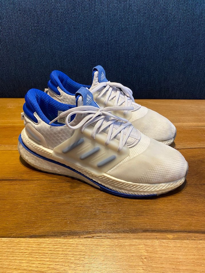 Beyaz bağcıklı basketbol ayakkabısı, açık mavi iç astar ve kauçuk tabanlı, sokak stili ve spor konforu sağlar.