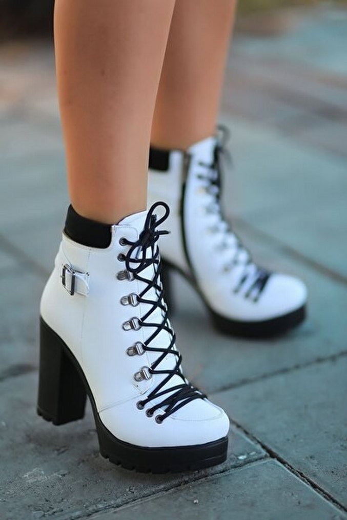 Beyaz Bağcıklı Blok Topuklu Kadın Bot