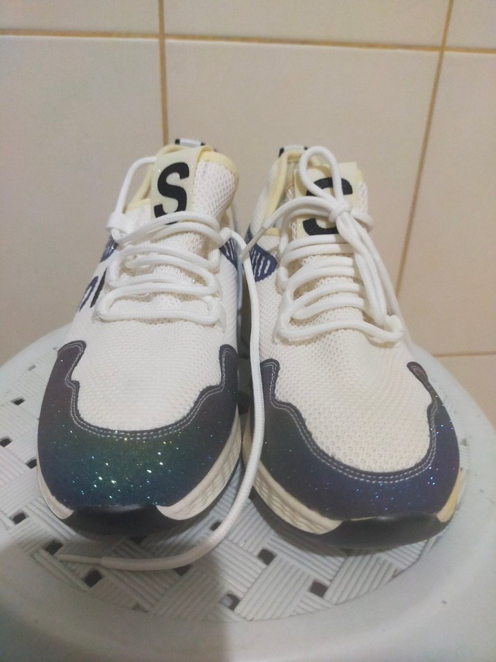 Elastik yapıya sahip, bağcıklı beyaz spor ayakkabı. Lastik tabanında tie-dye deseni ve stiletto topuk bulunur, 'S' logosu vardır.