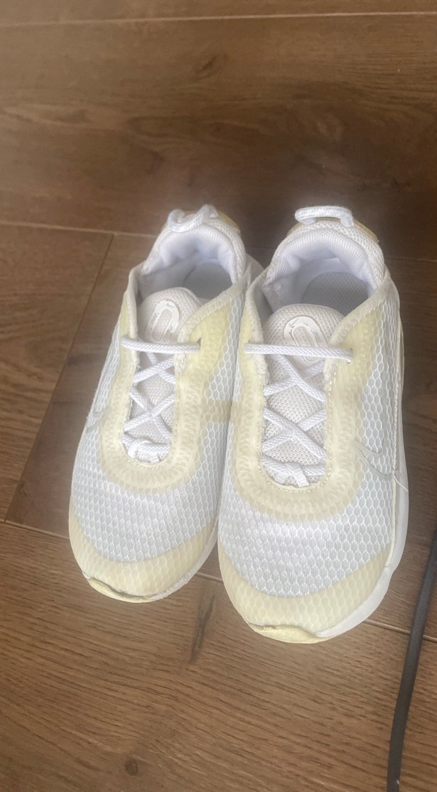 Beyaz renkli, bağcıklı ve kauçuk tabanlı erkek çocuk spor ayakkabısı. Düz, açık renkli ve desen içermeyen sokak stili. "KX" işaretli.