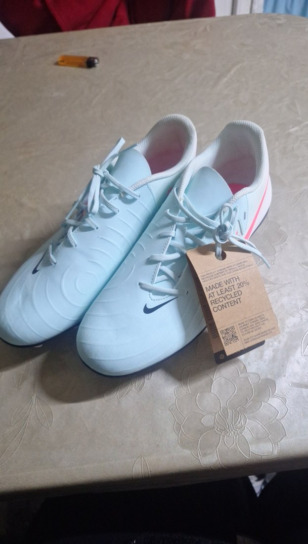 Bağcıklı, baskılı detaylara sahip beyaz erkek futbol ayakkabısı. Spor ve sokak stili için uygun, kauçuk tabanlı ve pastel renk dokunuşlu.