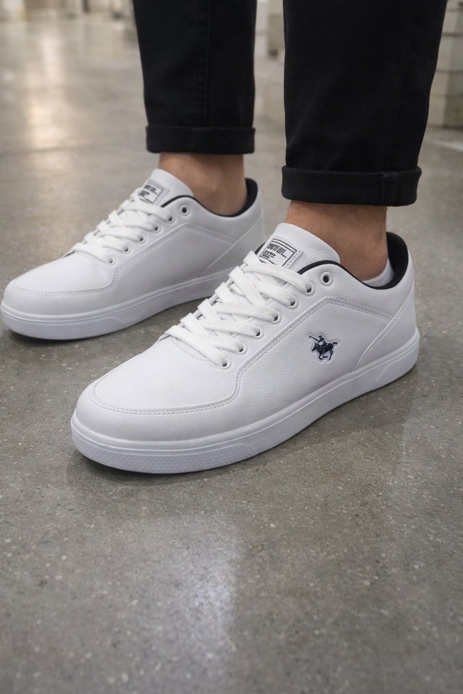 40-44 arası tüm bedenleri mevcuttur. Beyaz bağcıklı erkek sneaker, poli tabanlı ve desen siz. Günlük kullanım için uygun, athleisure tarzına uyumlu.