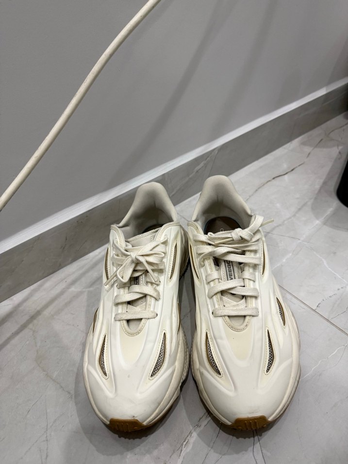 Stiletto topuklu, beyaz bağcıklı erkek spor ayakkabısı. Dayanıklı kauçuk tabanlı, sportif sokak tarzı için uygun.