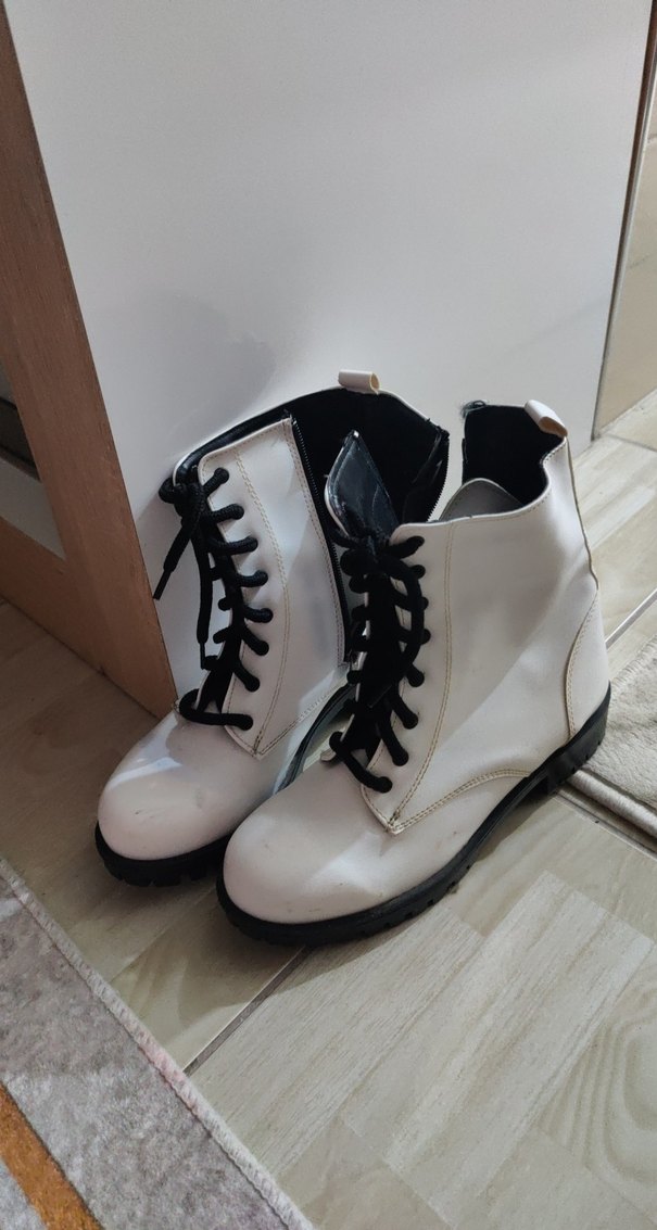 Beyaz, siyah bağcıklı, blok topuklu kadın botu. Kauçuk malzemeden üretilmiş, desensiz, gündelik ve şık tarz için uygun. 1 2 kere giyildi hiç bir aoeunu yoktur sadece kot panolonla giydikten sonra pantolon rengini aldı bot üsten başka birşeyi yoktur